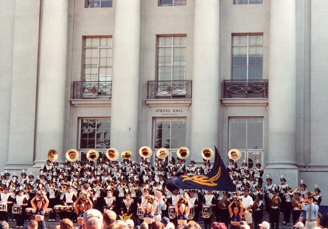 The 2000-2001 Cal Band at the game day concert on Sproul Hall steps.
